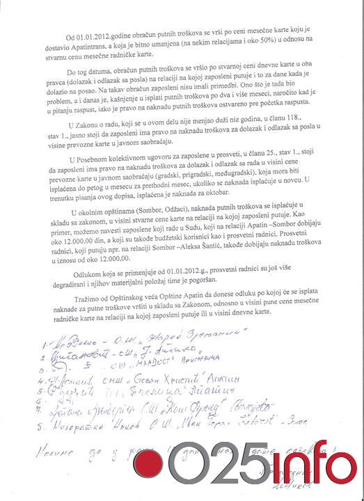 Kašnjenje isplate nije jedini problem sa kojim se prosvetni radnici susreću. Od 01.01.2012. godine iznos naknade je znatno umanjen i odstupa i od Zakona o radu i od Kolektivnog ugovora za zaposlene u prosveti. Prema Zakonu i Ugovoru jasno stoji da zaposleni ima pravo na naknadu troškova za dolazak i odlazak sa posla u visini prevozne karte u javnom saobraćaju. Međutim, kako saznajemo pod cenom prevozne karte javnog saobraćaja se smatra jedino umanjeni iznos mesečne karte za prevoznika Apatintrans. Interesantno je to da isti iznos putnih troškova za iste relacije ne važi i za ostale budžetske korisnike, a koji nisu prosvetni radnici. Predstavnici školskih sindikata su poslali žalbu Opštinskom veću Opštine Apatin kojom traže da se donese odluka kojom će se poštovati Zakon o radu i Kolektivni ugovor koji zaposleni imaju pa sada svima ostaje da čekaju razrešenje situacije.