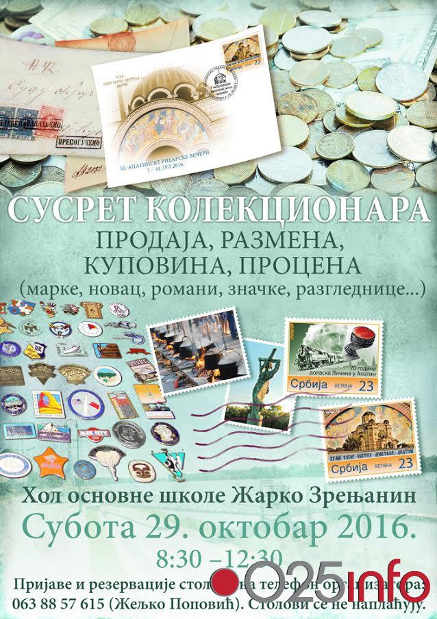 Obaveštavamo sve zainteresovane posetioce da će se u subotu, 29. oktobra, u periodu od 8 i 30 do 12 i 30 časova, u Holu osnovne škole „Žarko Zrenjanin“ u Apatinu održati, tradicionalni, 5. Susret kolekcionara.
