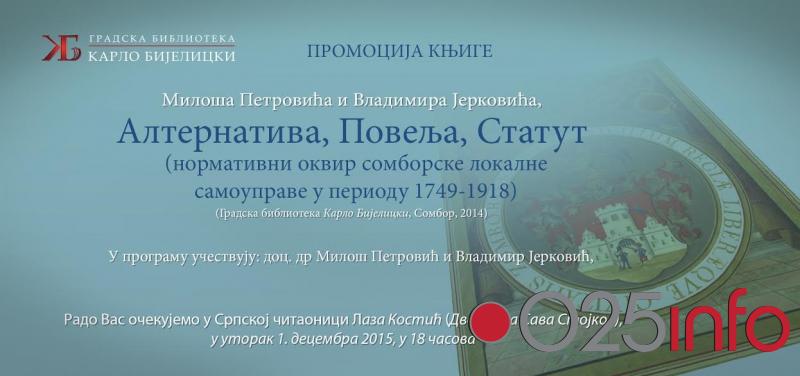 Gradska biblioteka Karlo Bijelicki Sombor u utorak 1. decembra organizuje promociju knjige, koja je objavljena polovinom avgusta 2014. godine, Alternativa, Povelja, Statut (normativni okvir somborske lokalne samouprave u periodu 1749-1918) koju su načinili doc. dr Miloš Petrović i Vladimir Jerković, doktorant na Filološkom fakultetu u Beogradu.