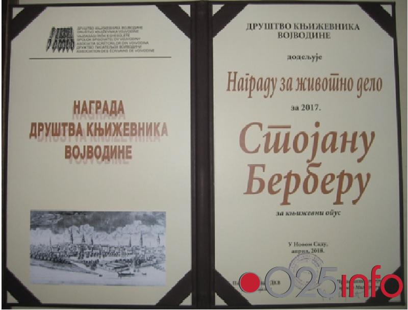 Za životno delo nagrada je uručena prof. dr Stojanu Berberu za njegov impozantan životni opus (od čega dva zapažena i obimna romana), koji je istovremeno ocenjen visokim umetničkim dometom. Kaže se, između ostalog, u obrazloženju DKV: „Sa više od pedeset naslova, knjigama poezije, proze, sa nekoliko antologija, knjigama dnevničke, odsnosno memoarske proze, čemu se poslednjih godine najviše posvećuje knjigama „Ravangradski zapisi“, „Svedok vremena“, „Dnevnik o Dobrici Ćosiću“ i „Venac Laze Kostića“, Stojan Berber je (uz zapažene knjige o Milošu Crnjanskom) i obimom i kvalitetom svojih dela potvrdio i meru i smisaonost vlastite posvećenosti lepoj i mudroj, istraživačkoj i osvetljivačkoj književnoj reči“.