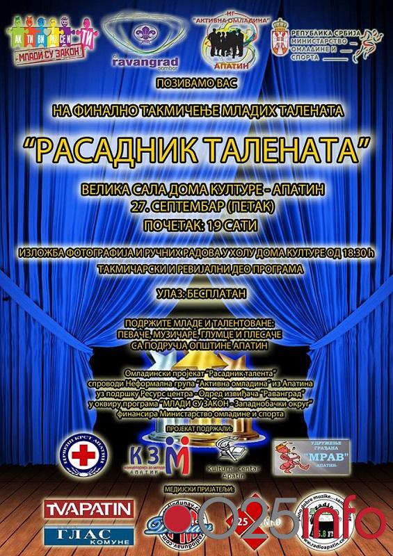 Finalno veče takmičenja mladih talenata pod nazivom "Rasadnik talenata",održaće se u petak, 27. septembra, u Velikoj sali apatinskog Doma kulture.