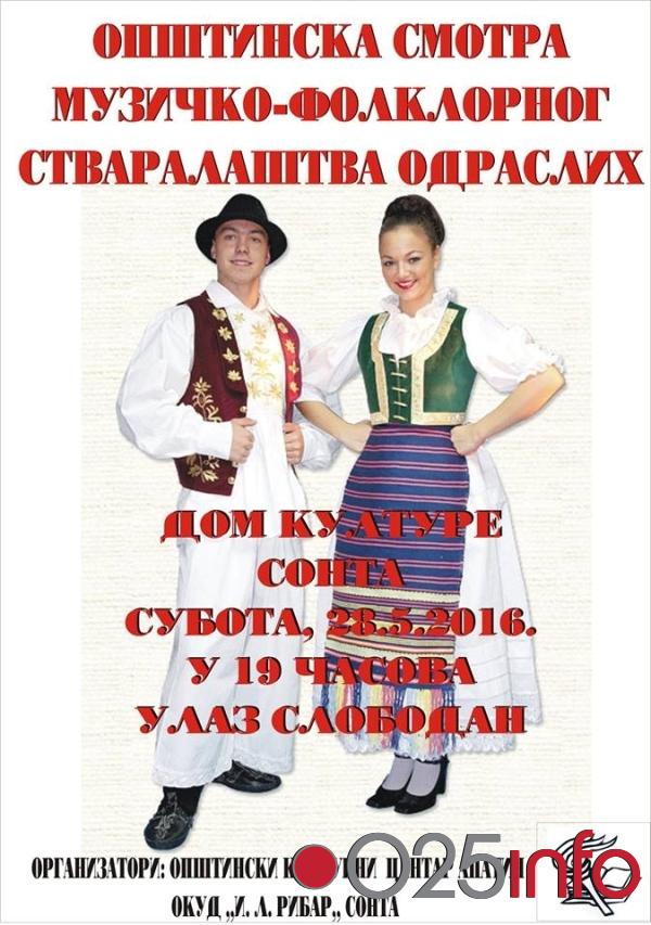 Opštinska smotra muzičko - folklornog stvaralaštva za odrasle biće održana sutra (28.05) u 9 sati u Sonti.