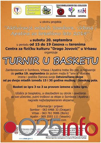 Somborski edukativni centar uz podršku Ministarstva omladine i sporta Republike Srbije, a u saradnji sa Kancelarijama za mlade Sombora, Vrbasa i Apatina, u okviru programa "Aktiviranje mladih Sombora, Vrbasa i Apatina za kreativno leto 2014" organizuje turnir u basketu.